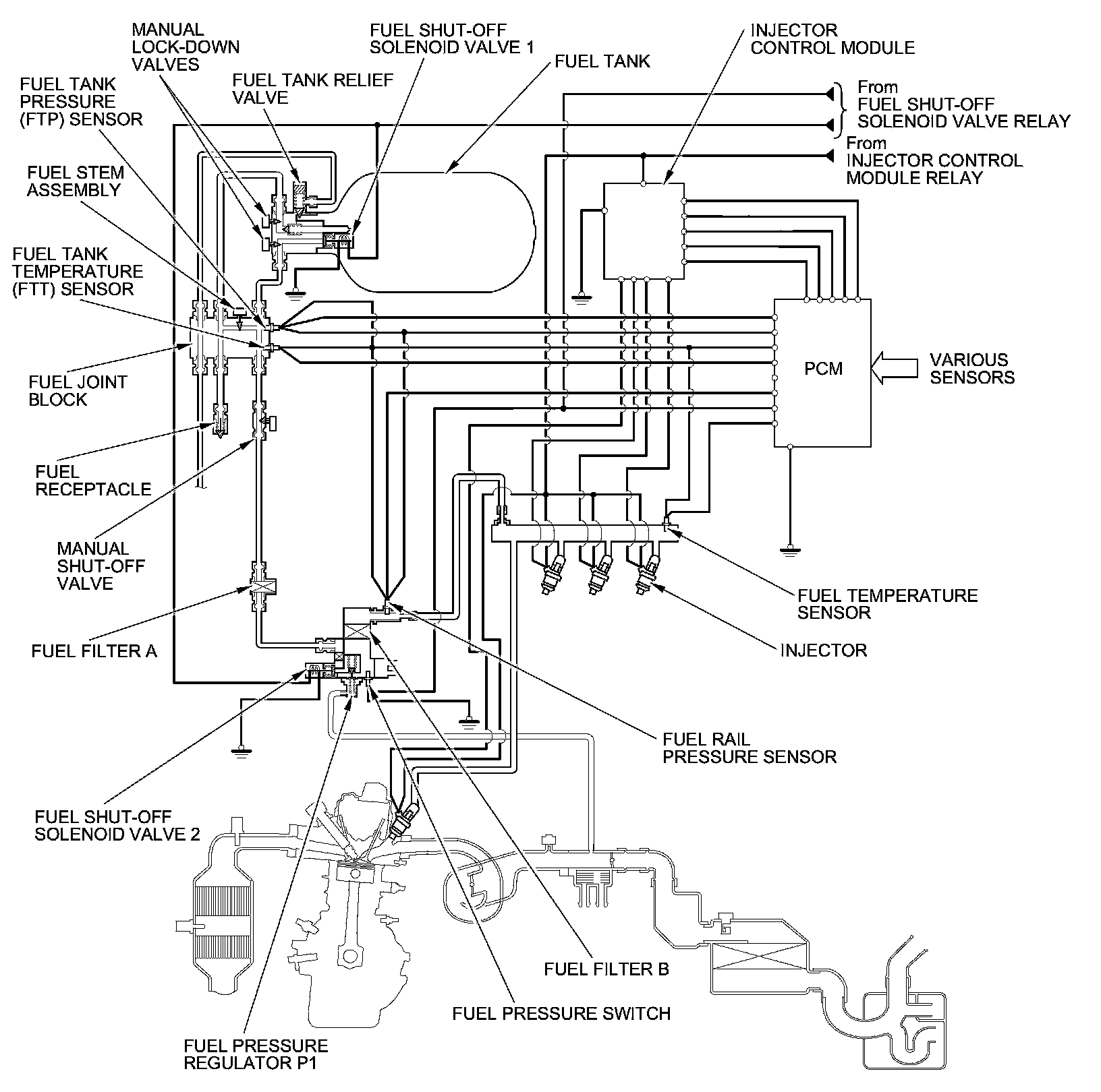 The fuel supply system consists of the fuel tank, the injectors, the fuel tank pressure (FTP) sensor, the fuel tank temperature (FTT) sensor, the fuel rail pressure sensor, the fuel temperature sensor, the injector control module, the injector control module relay, fuel shut-off solenoid valve 1, fuel shut-off solenoid valve 2, fuel pressure regulator P1, the fuel pressure switch, the fuel filters, and the manual shut-off valve.