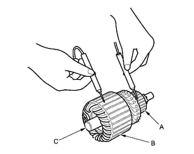 9. Use an ohmmeter to check for continuity between the commutator (A) and the armature coil core (B), and between the commutator and the armature shaft (C). If there is continuity, replace the armature.