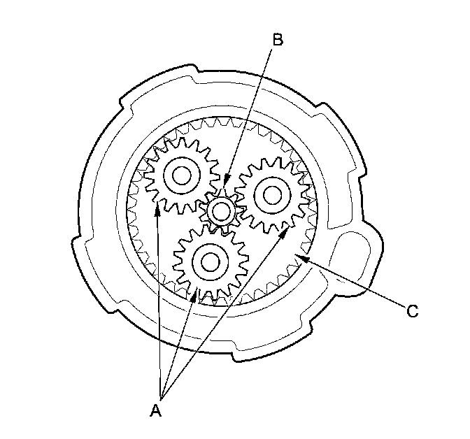12. Check the planetary gears (A), the armature shaft gear (B), and the internal ring gear (C). Replace them if they are worn or damaged.