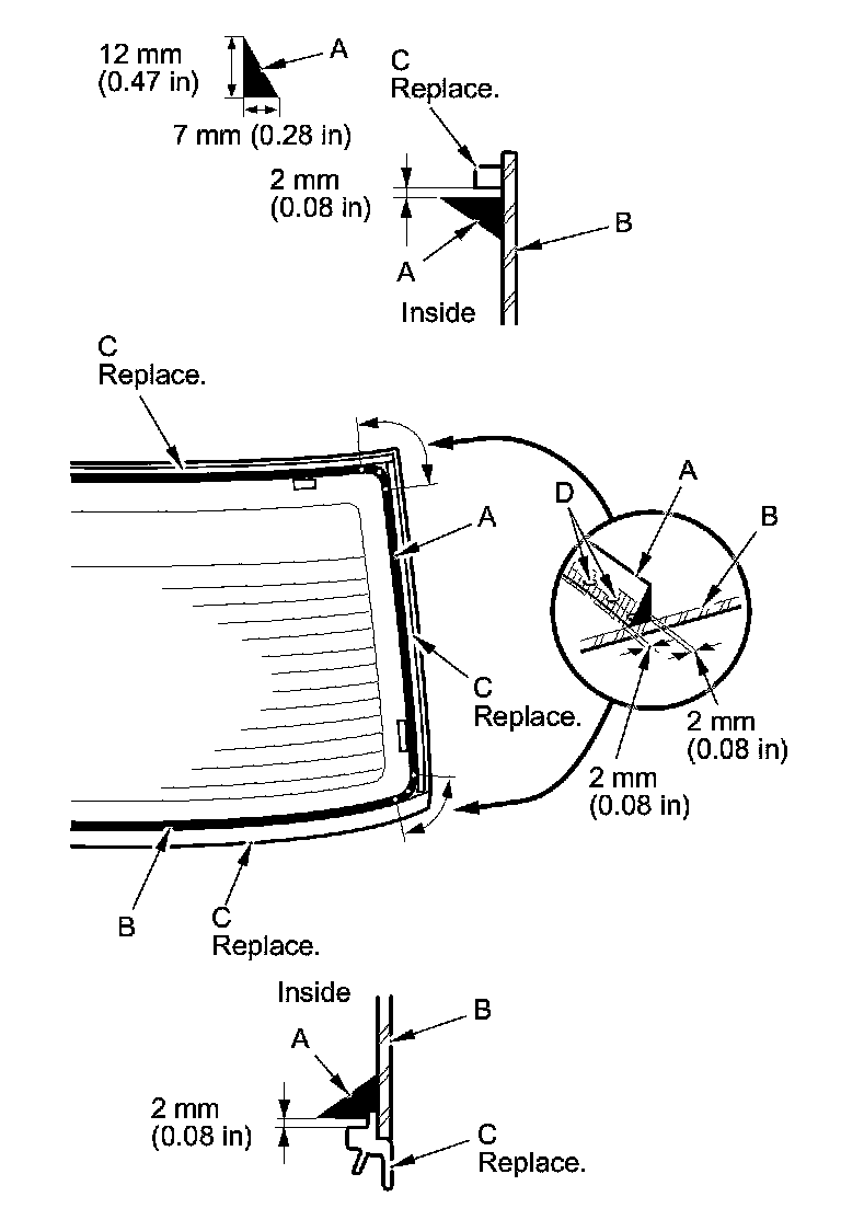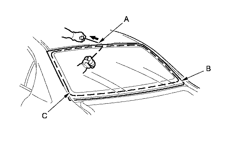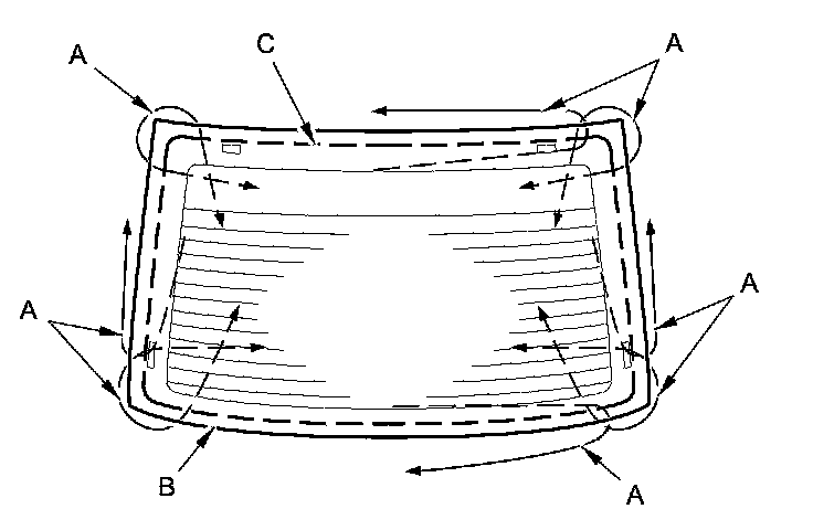 12. Apply glass primer to the edge of the rear window (A) where the new lower rubber dam (B) will be attached as shown. Attach the lower rubber dam with adhesive tape (C) to the lower edge of the rear window: