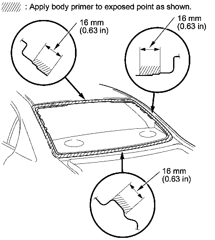 18. Carefully apply a light coat of body primer to any exposed paint or metal around the flange where the new adhesive will be applied. Let the body primer dry for at least 10 minutes: