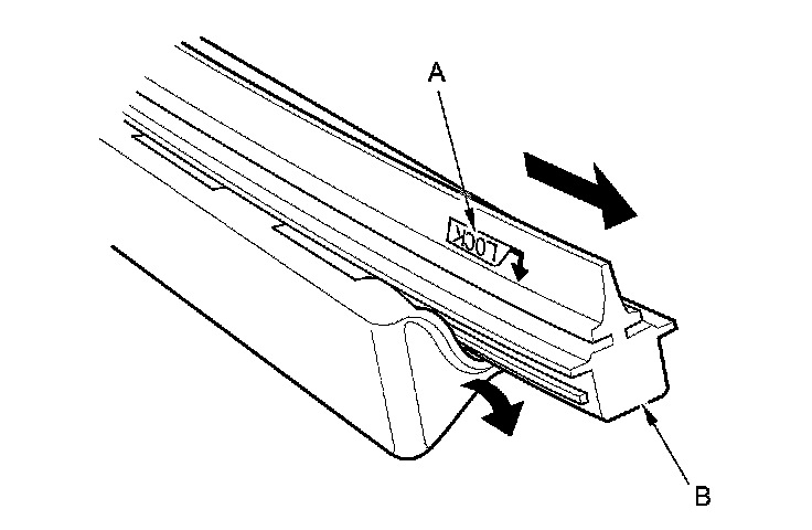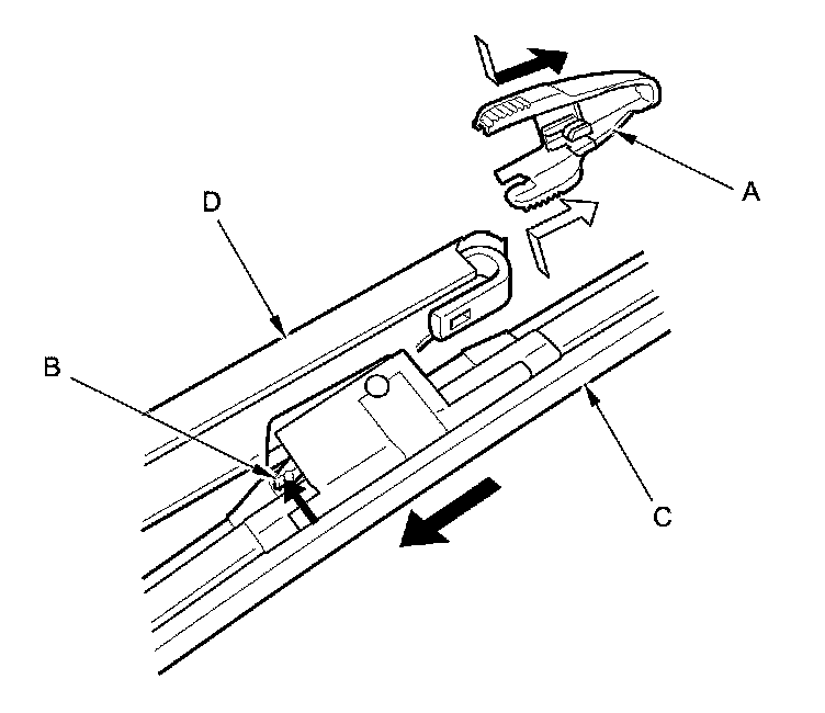 3. Press and hold the tab (B) and slide the wiper blade (C) toward the tabs until it releases from the wiper arm (D).