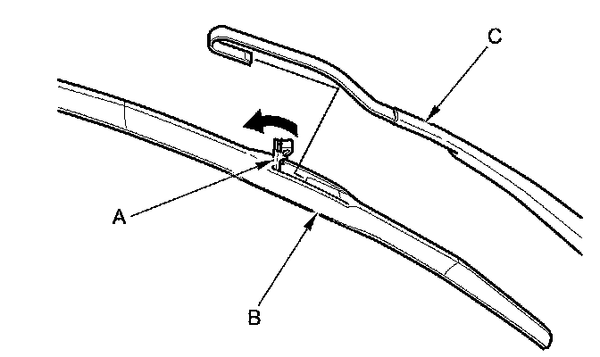 2. Pull up the tab (A), and slide the wiper blade (B) until it releases from the wiper arm (C).