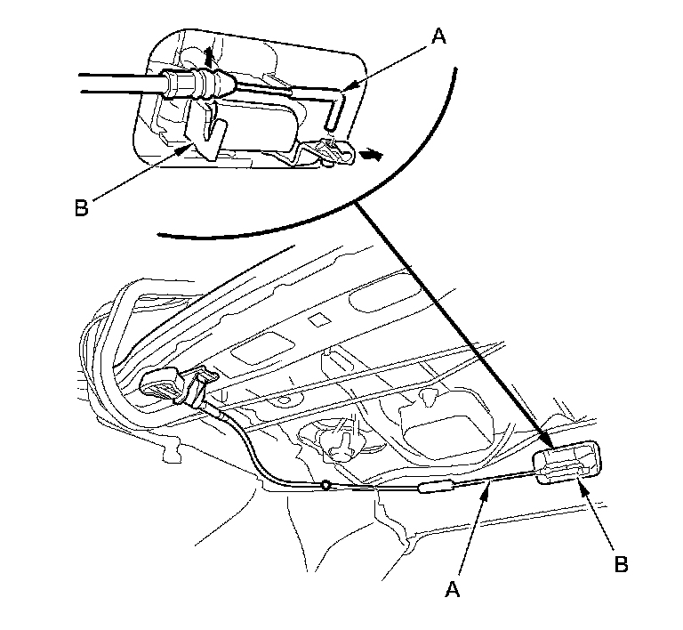 2. From the trunk compartment, disconnect the seat-back release cable (A) from the seat-back latch (B).