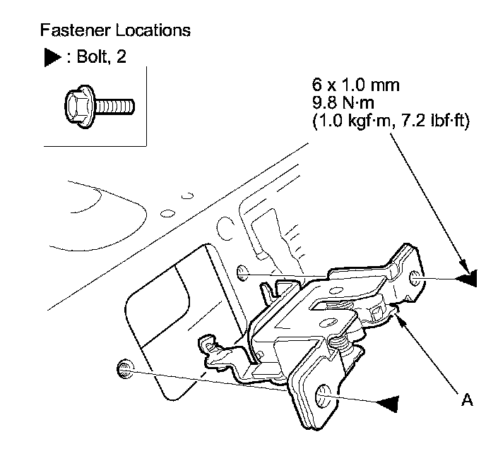 3. Remove the bolts, then remove the seat-back latch (A).
