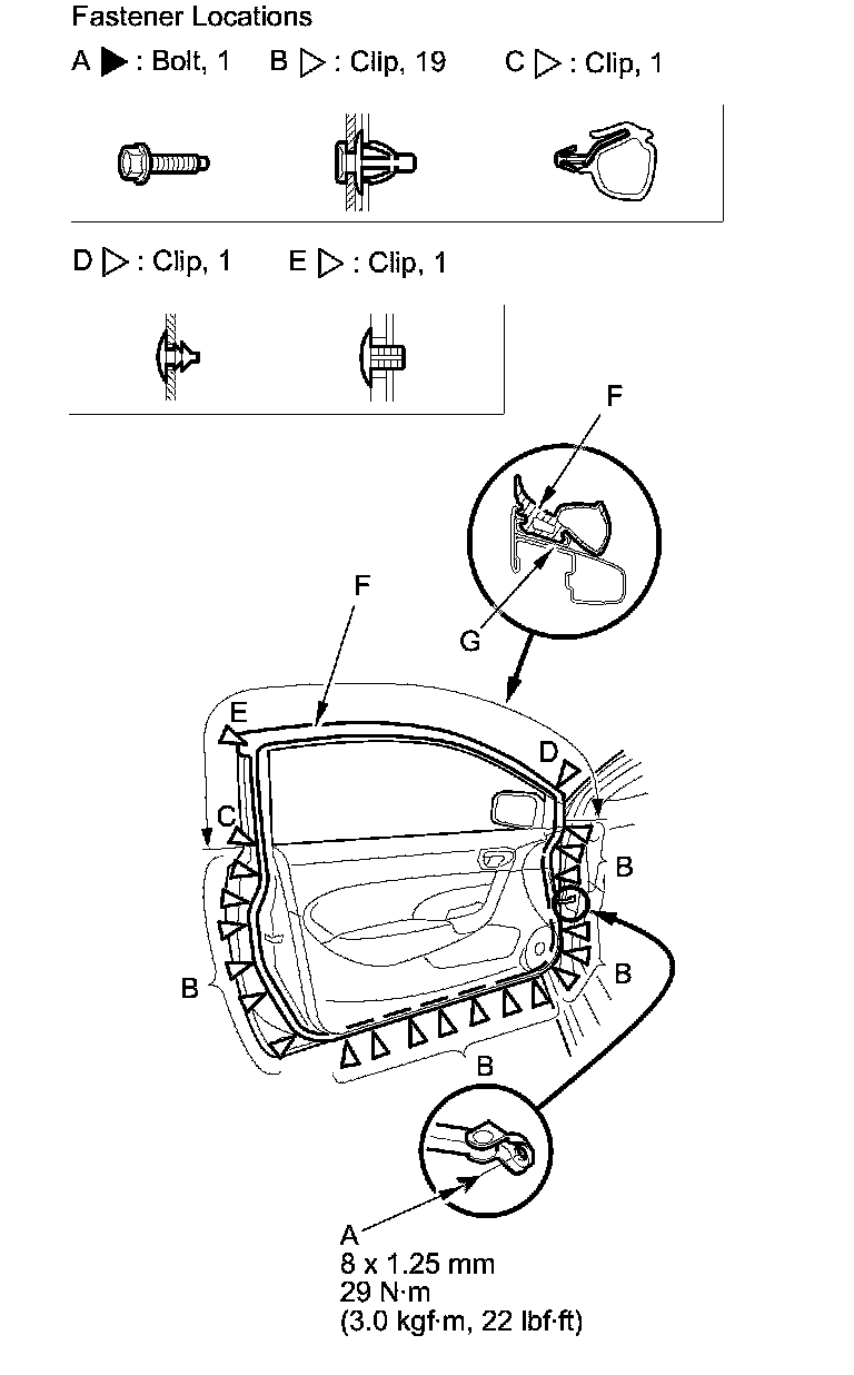 2. Detach the clips (B, C, D, E), and release the door weatherstrip (F) from the holder (G) of the door sash, then remove the weatherstrip.