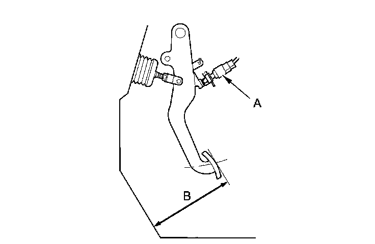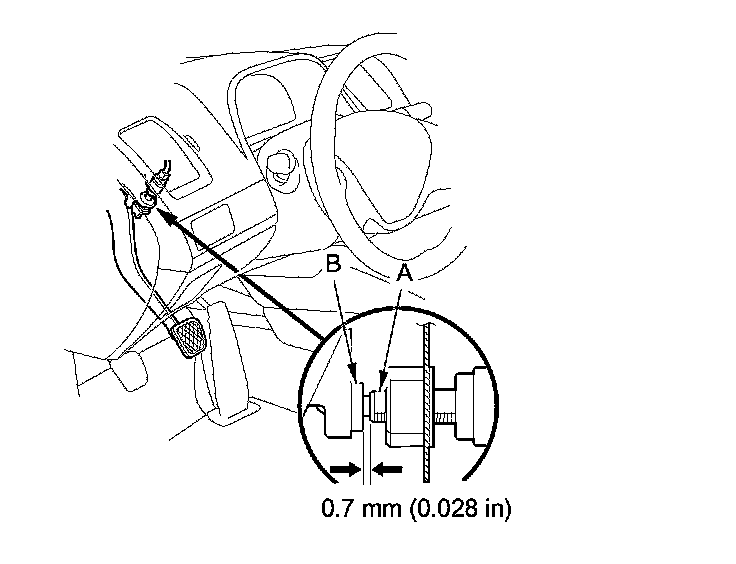 4. Lift up on the brake pedal by hand. Push in the brake pedal position switch until its plunger is fully pressed (threaded end (A) touching the pad (B) on the pedal arm). Turn the switch 45 ° clockwise to lock it. The gap between the brake pedal position switch and the pad is automatically adjusted to 0.7 mm (0.028 in) by locking the switch. Make sure the brake lights go off when the pedal is released.