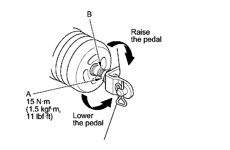 3. Loosen the pushrod locknut (A), and screw the pushrod (B) in or out with pliers until the standard pedal height from the floor is reached. After adjustment, tighten the locknut firmly. Do not adjust the pedal height with the pushrod pressed.