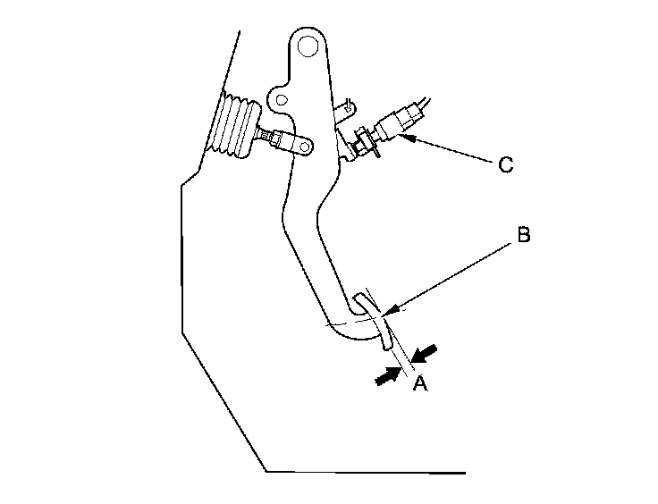 1. With the ignition switch in LOCK (0), inspect the free play (A) at the pedal pad (B) by pushing the brake pedal by hand. If the brake pedal free play is out of specification, adjust the brake pedal position switch (C). If the brake pedal free play is insufficient, it may result in brake drag.