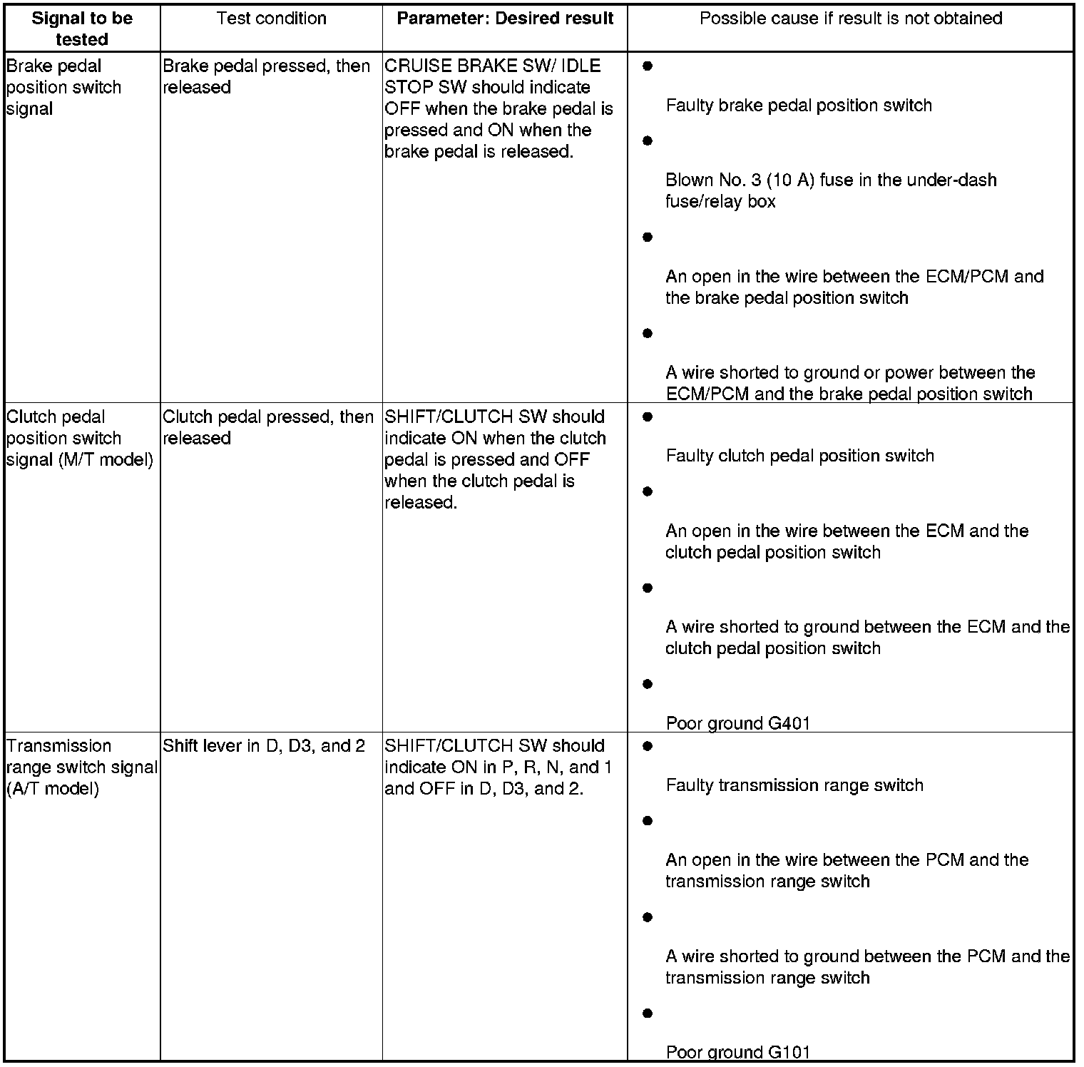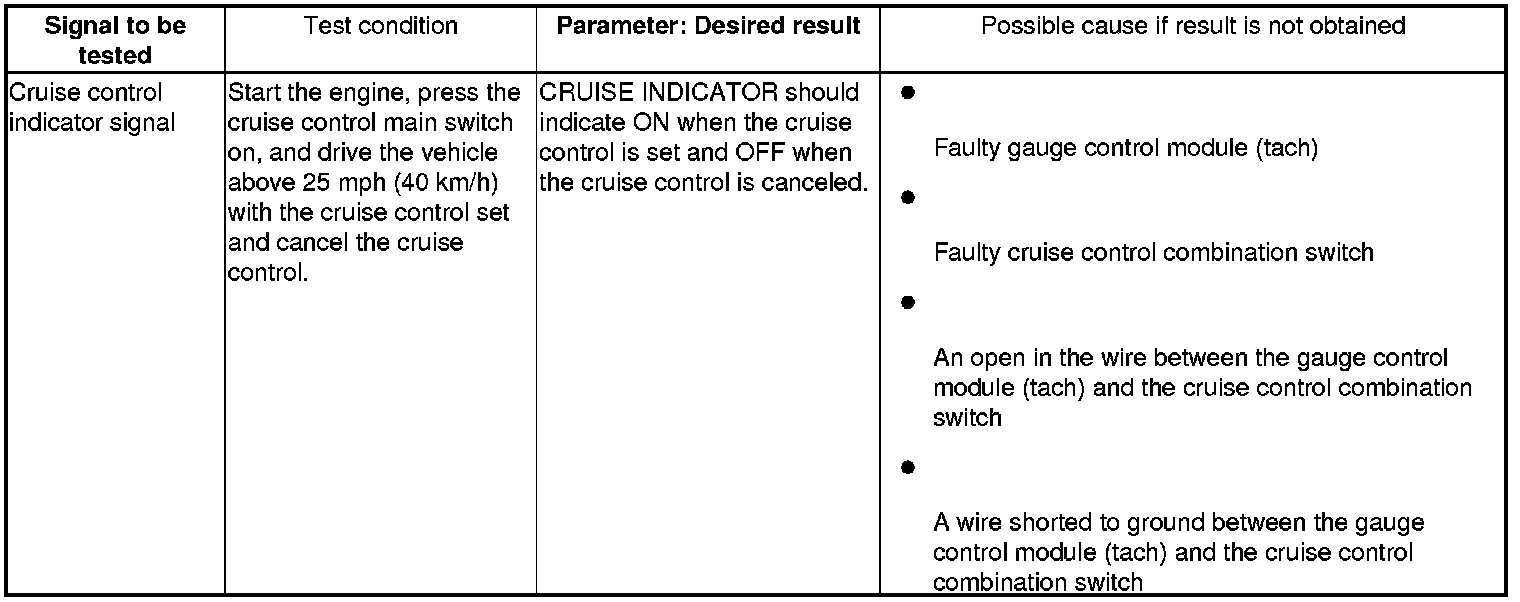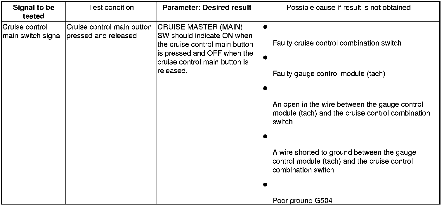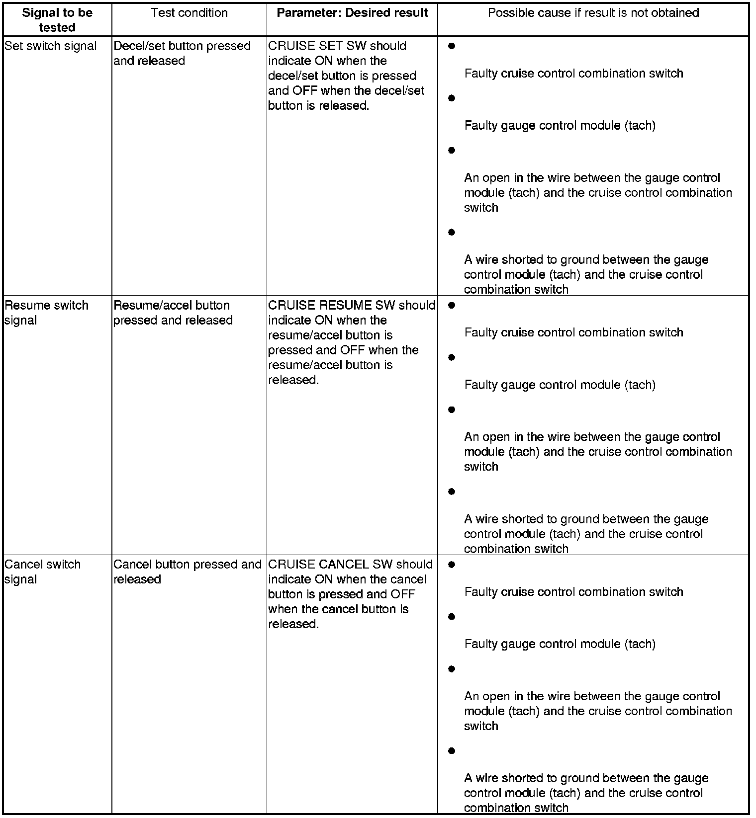 NOTE: Intermittent failures are often caused by loose circuit connections. While monitoring cruise control inputs, flex the circuit wires, and note if any of the test results change.