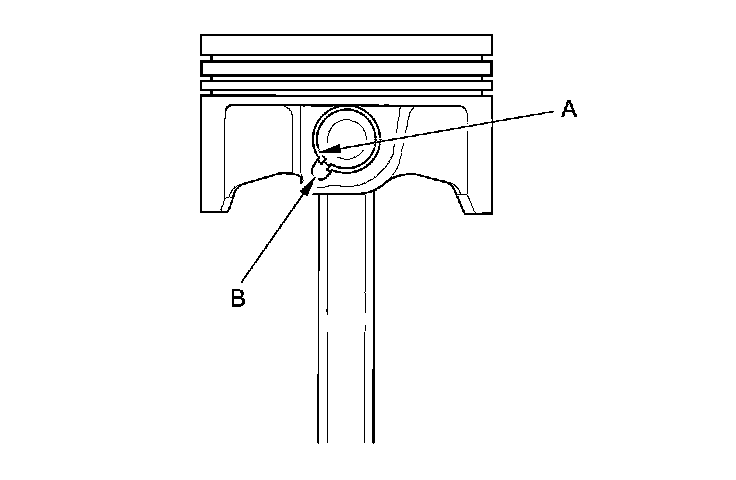 2. Apply new engine oil to the piston pin snap rings (A), and turn them in the ring grooves until the end gaps are lined up with the cutouts in the piston pin bores (B).