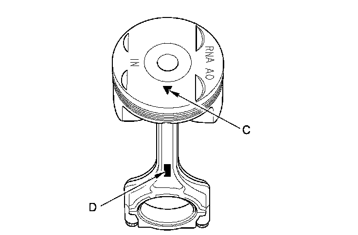 4. Assemble the piston (A) and the connecting rod (B) with the mark (C) and the embossed mark (D) on the same side. Install the piston pin (E).