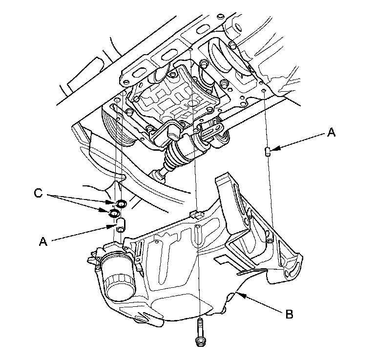 4. Install the dowel pins (A), then install the oil pan (B) with new O-rings (C).