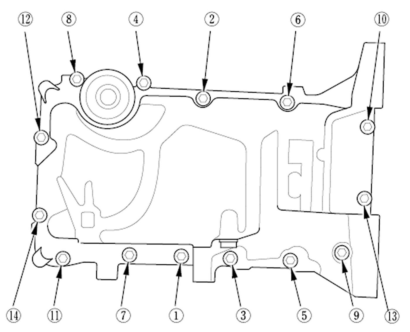 1. Remove all of the old liquid gasket from the oil pan mating surfaces, the bolts, and the bolt holes.