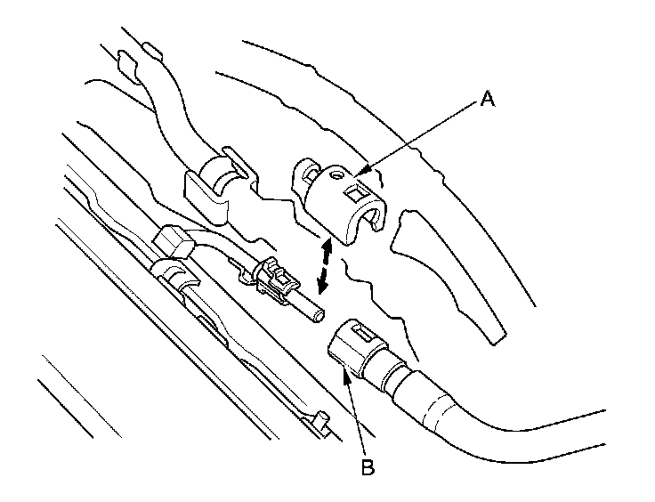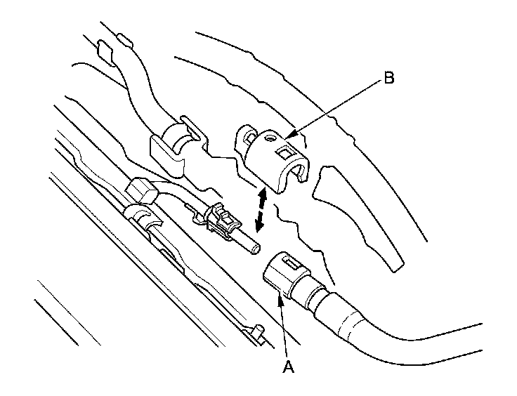 7. Remove the quick-connect fitting cover (A), then disconnect the fuel feed hose (B) Fuel Line/Quick-Connect Fitting Removal.
