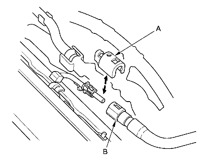 42. Disconnect the A/C compressor clutch connector (A), then remove the harness clamp (B).