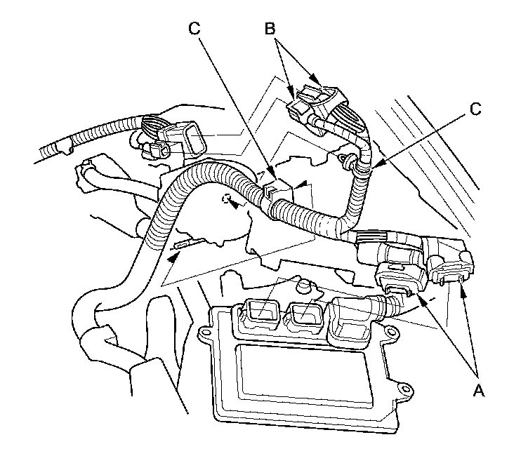 14. Remove the harness clamps (C).