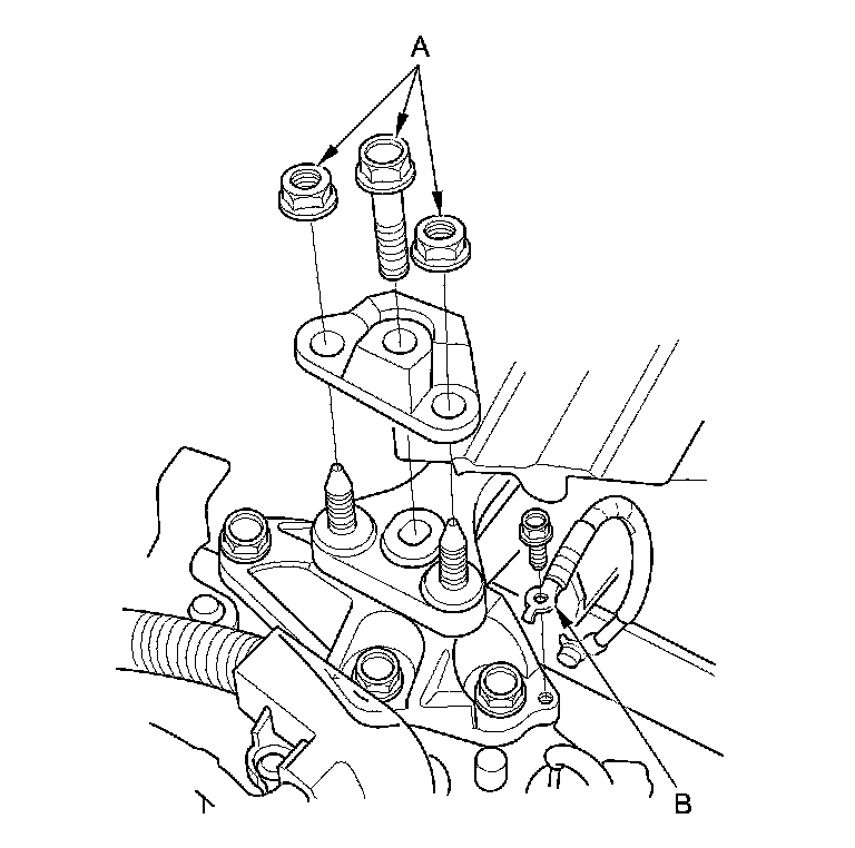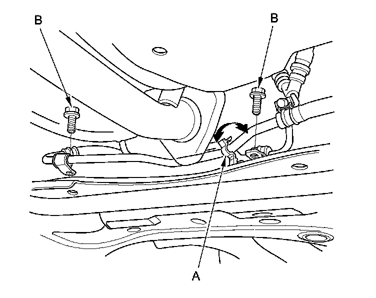 32. Hydraulic power steering model: Unclamp the power steering fluid line clamp (A) on the front subframe, and remove the power steering line mounting bolts (B).