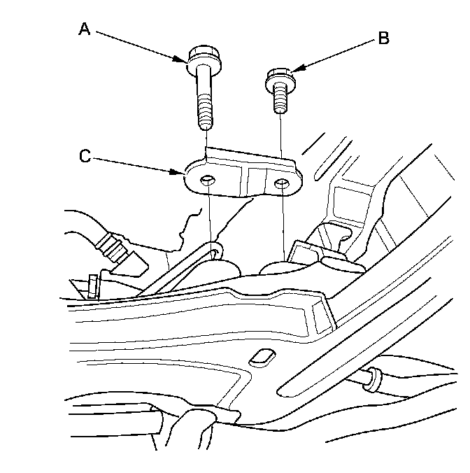 37. EPS model: Remove the steering gearbox mounting bolt (A), the stiffener mounting bolt (B), and the stiffener (C).
