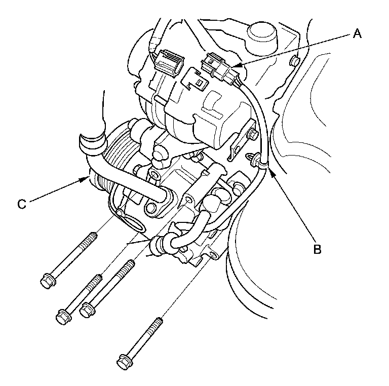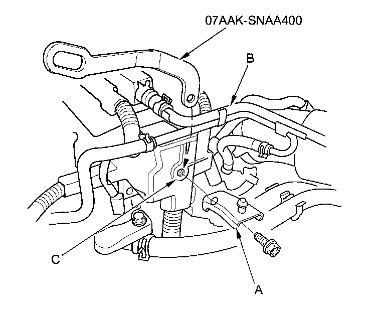 9. Disconnect the EVAP canister hose (A) and the brake booster vacuum hose (B), and remove the power steering hose clamp (C).