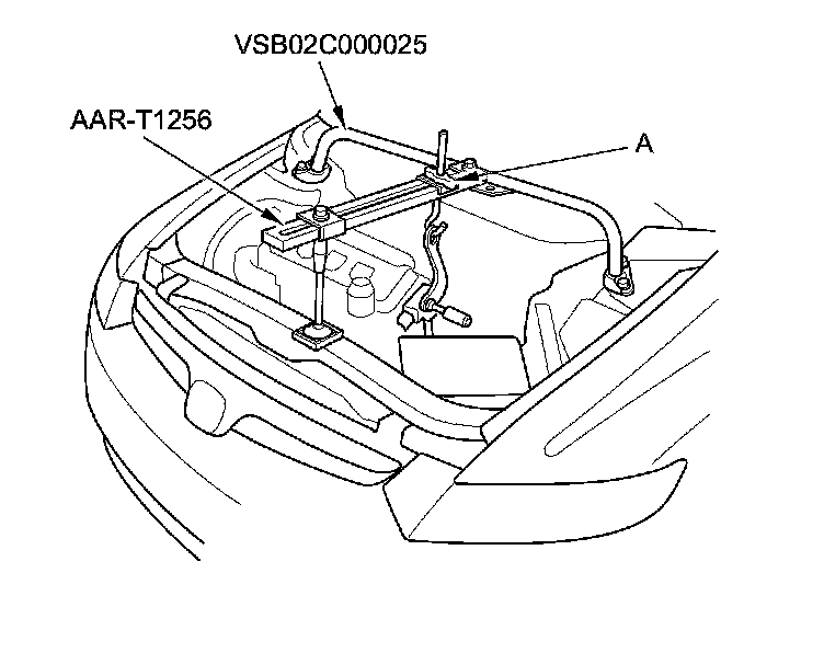 1. Open the hood, and secure it with hood support rod (A) in the wide-open position (B).