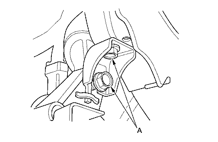 61. Remove the transmission mount bracket mounting bolt and the nuts (A).