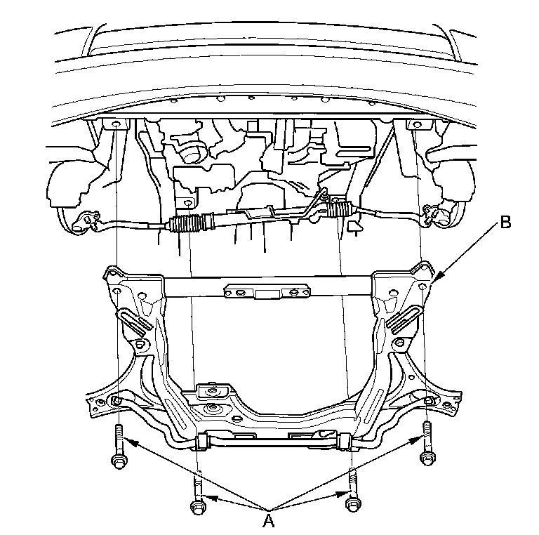 56. Remove the front subframe mounting bolts (A), then lower the front subframe (B).
