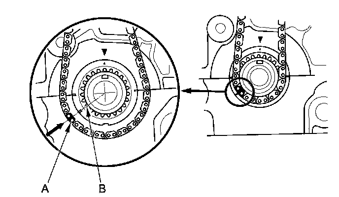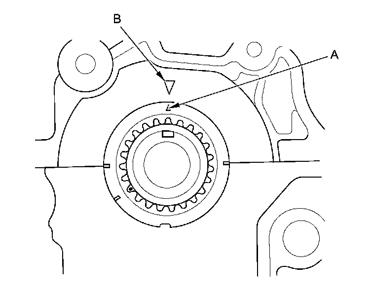1. Set the crankshaft to top dead center (TDC). Align the TDC mark (A) on the crankshaft sprocket with the pointer (B) on the engine block.