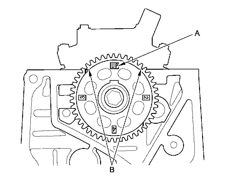 2. Set the camshaft to TDC. The "UP" mark (A) on the camshaft sprocket should be at the top, and the TDC grooves (B) on the camshaft sprocket should line up with the top edge of the head.