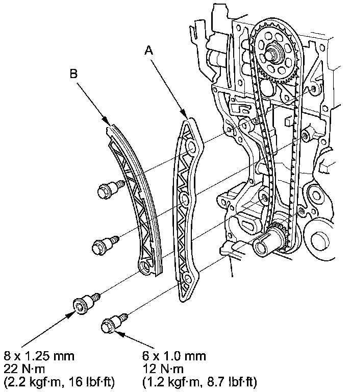 5. Install the cam chain guide (A) and the cam chain tensioner arm (B).