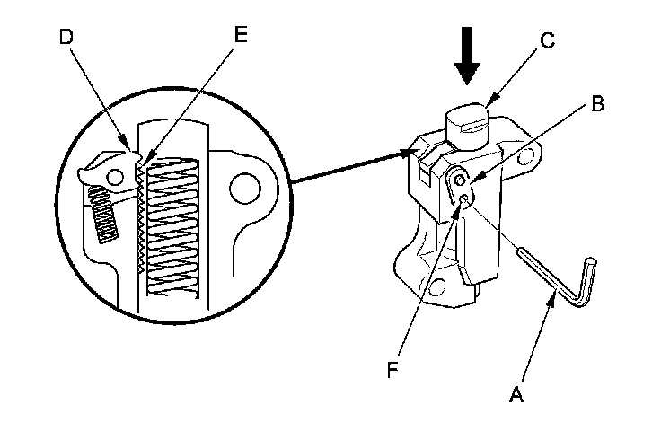 6. Compress the auto-tensioner when replacing the cam chain. Remove the 1.0 mm (1/32 in) diameter pin (A) from the auto-tensioner that was installed during removal. Turn the plate (B) counterclockwise, to release the lock, then press the rod (C), and set the first cam (D) to the first edge of the rack (E). Insert the diameter pin into the holes (F).