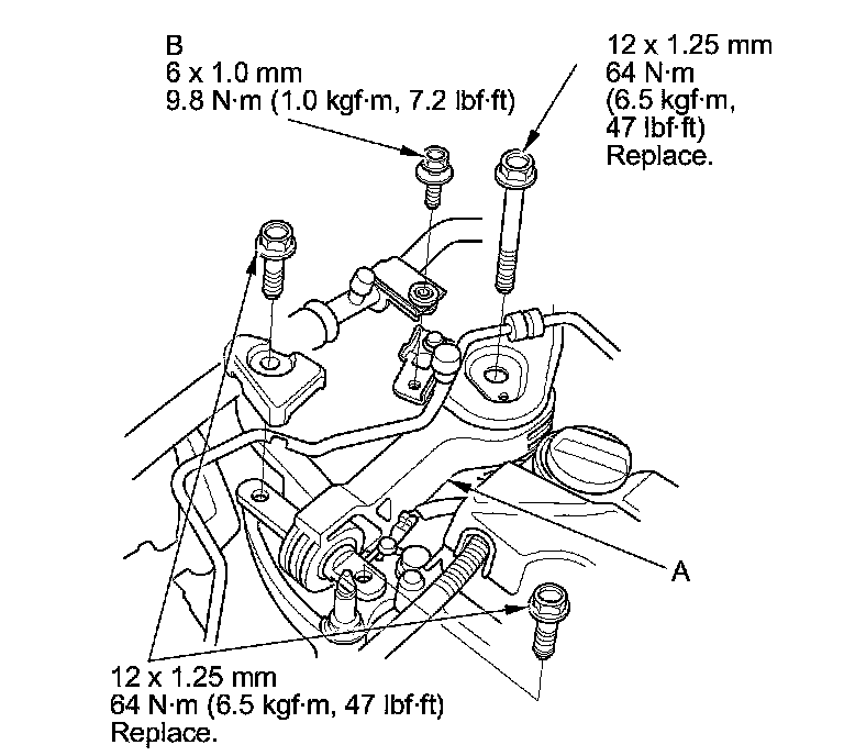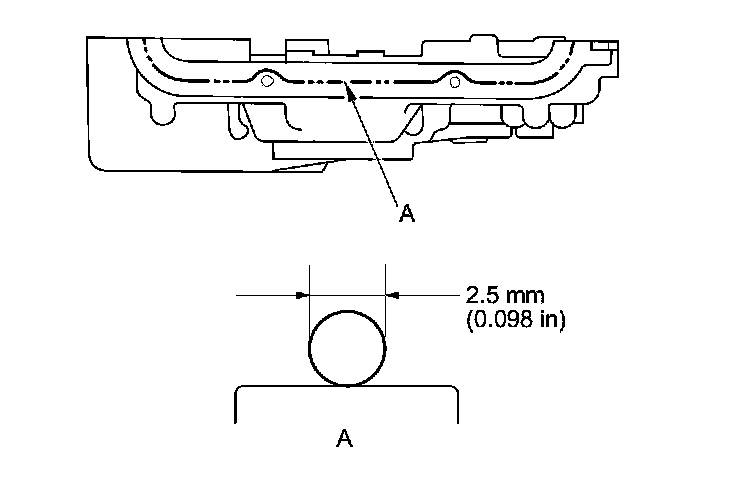 - Apply a 2.5 mm (0.098 in) diameter bead of liquid gasket along the broken line (A).