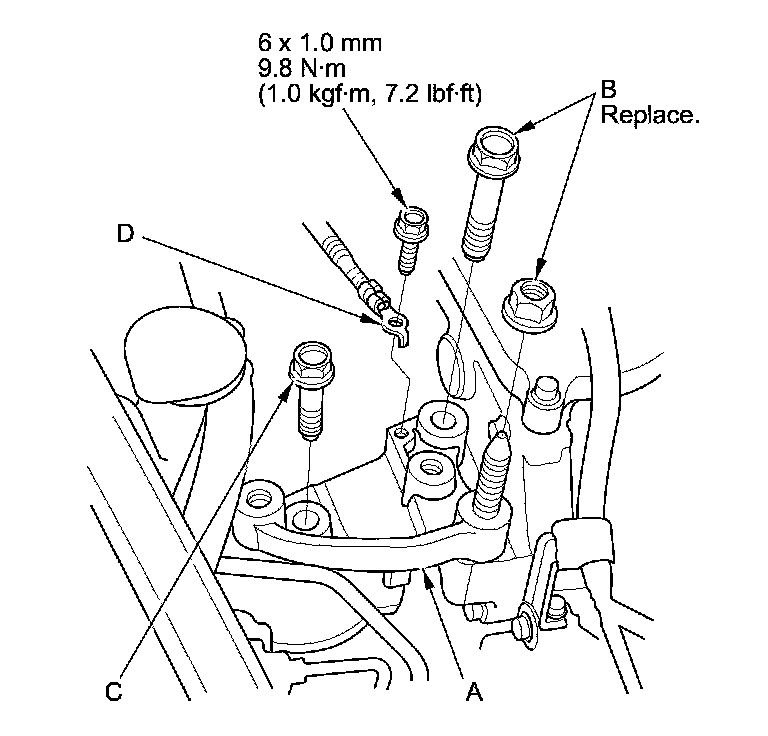 15. Install the side engine mount bracket (A), then loosely tighten the new bolt and nut (B), then loosely tighten the bolt (C).