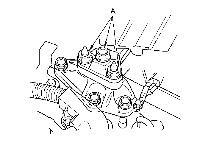 18. Loosen the transmission mount bracket mounting bolt and nuts (A).