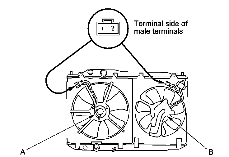 1. Disconnect the 2P connectors from the radiator fan motor (A) and the A/C condenser fan motor (B).