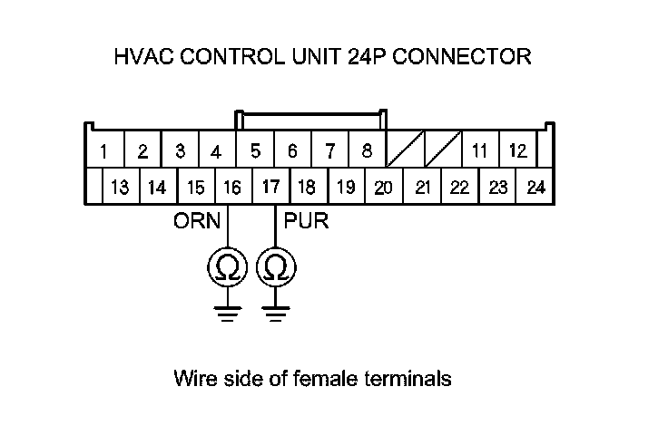 8. Check for continuity between body ground and HVAC control unit 24P connector terminals No. 16 and No. 17 individually.