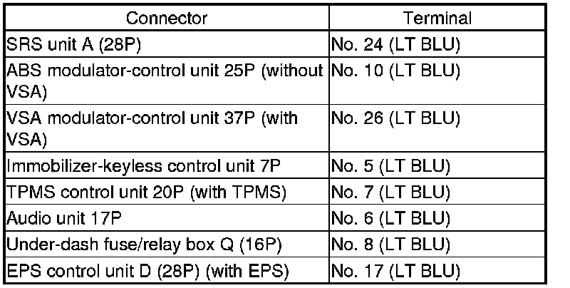 Repair short in the wire between the DLC (K-line) and the ABS modulator-control unit (without VSA), the VSA modulator-control unit (with VSA), the SRS unit, the immobilizer-keyless control unit, the TPMS control unit (With TPMS), EPS control unit (with EPS), the audio unit, or the under-dash fuse/relay box.�