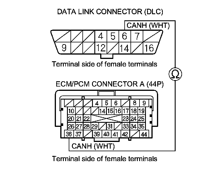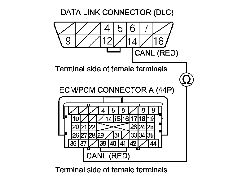 36. Check for continuity between ECM/PCM connector terminal A37 and DLC terminal No. 14.
