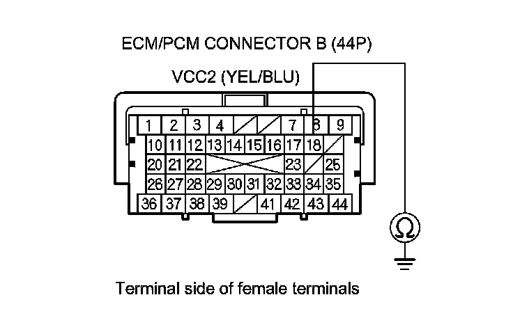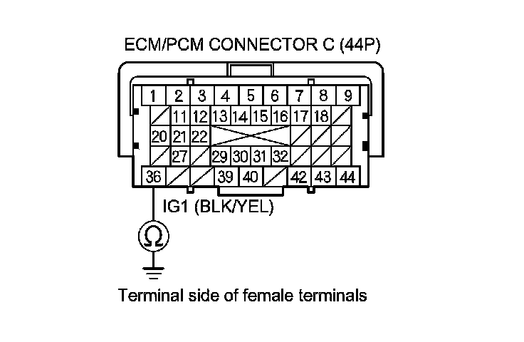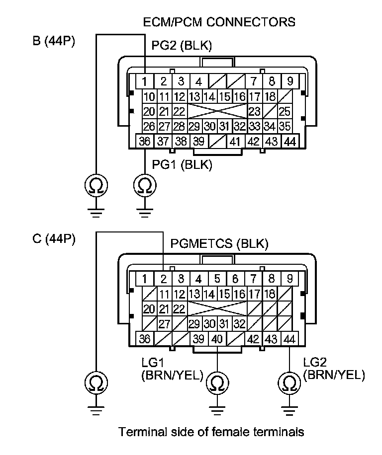 73. Check for continuity between body ground and ECM/PCM connector terminals B1, B36, C2, C40, and C44 individually.