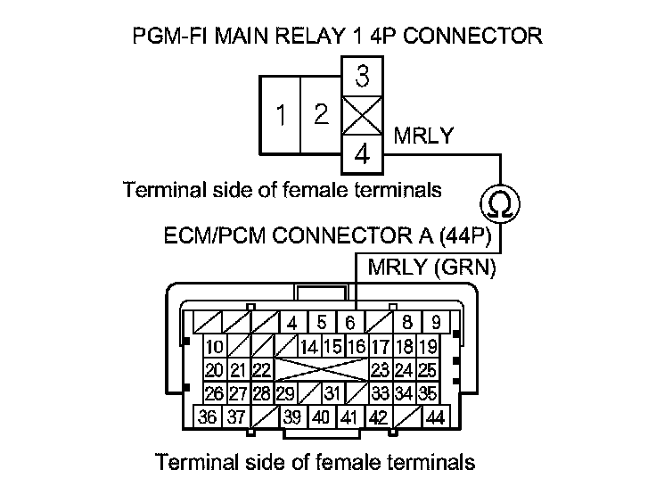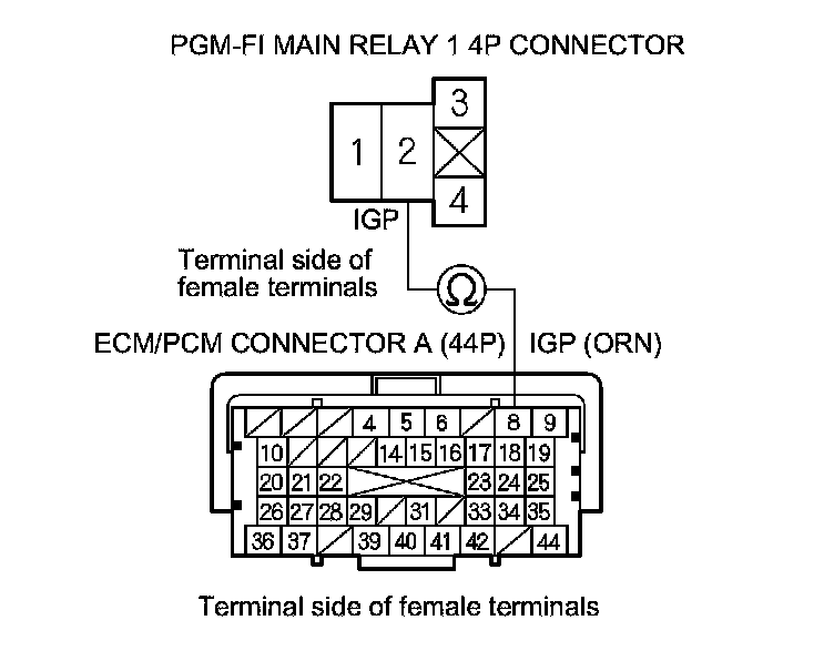 46. Check for continuity between PGM-FI main relay 1 4P connector terminal No. 2 and body ground.