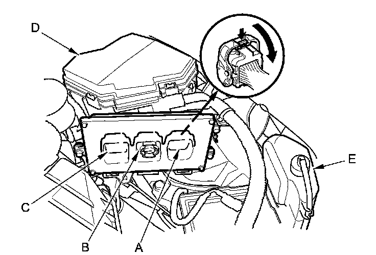 4. Remove the coolant reservoir (E). Disconnect ECM/PCM connectors A, B, and C.