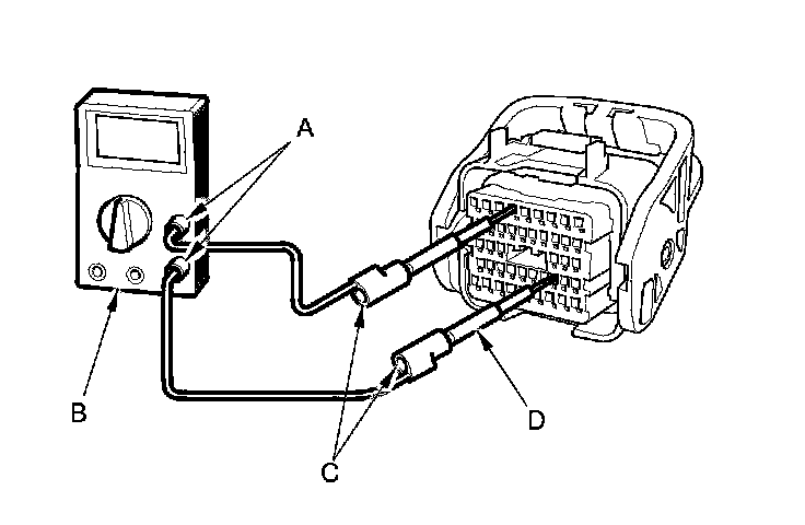 6. Connect one side of the patch cord's terminals (A) to a commercially available digital multimeter (B), and connect the other side of the terminals (C) to a commercially available banana jack (Pomona Electronics Tool No. 3563 or equivalent) (D).