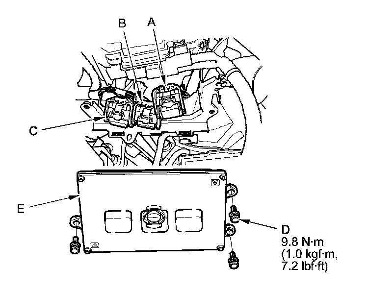 10. Remove the bolts (D), then remove the ECM/PCM (E).