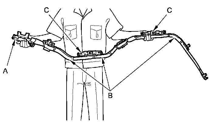 - The side curtain airbag module assembly is a long, jointed part containing an inflator (A), a flexible bag (B), and brackets (C). When removing or installing the side curtain airbag assembly, never: