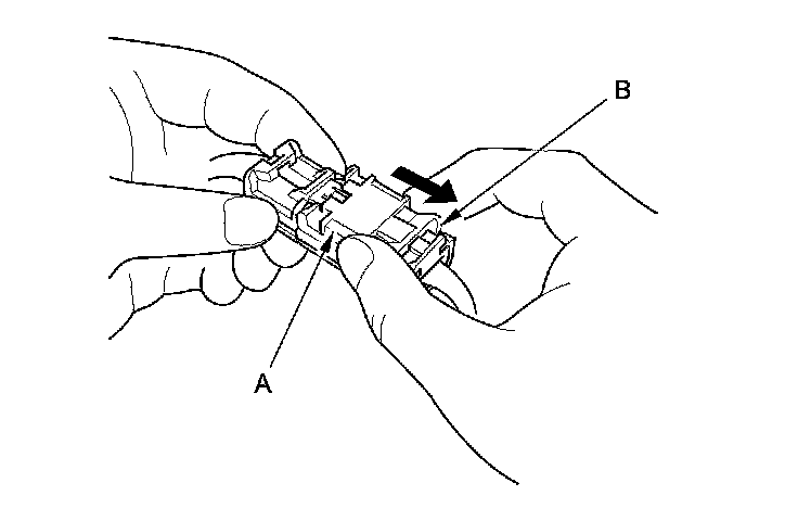 To reconnect, hold the pawl-side connector, and press on the back of the sleeve-side connector in the direction shown. As the two connector halves are pressed together, the sleeve (A) is pushed back by the pawl (B). Do not touch the sleeve.