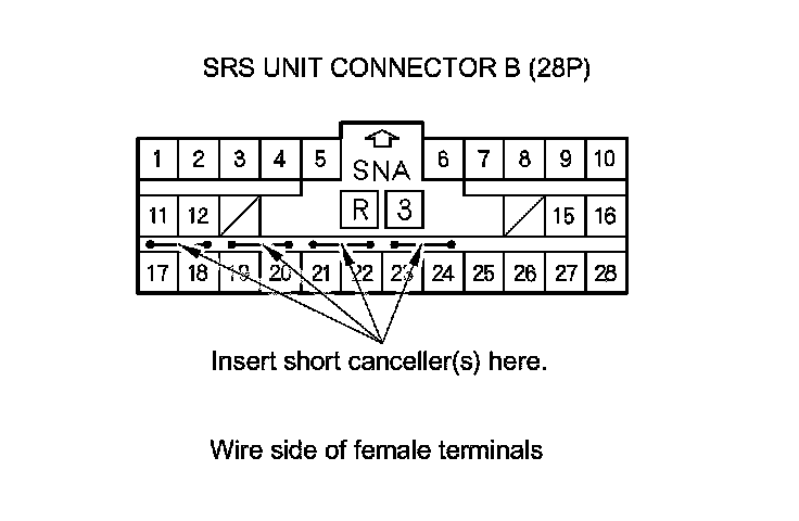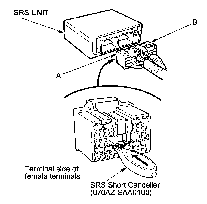 When SRS unit connectors A (28P) and B (28P) are disconnected, short circuits are automatically created in the connector to prevent accidental deployment of an airbag or tensioner. The circuit may need to be opened sometimes when testing the system. Insert an SRS short canceller (070AZ-SAA0100) in the specified cavities when is necessary to keep the circuit open for diagnosis.