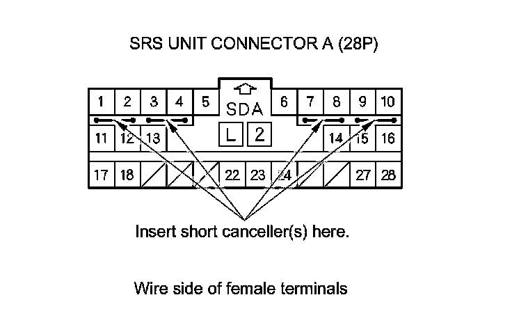 Terminal numbers are shown from the wire side of the female terminals. Insert the SRS short canceller(s) into the cavities on the terminal side of the connector.