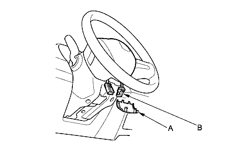 2. Remove the access panel (A) from the steering wheel, then disconnect the cable reel 4P connector (B) from the driver's airbag 4P connector.