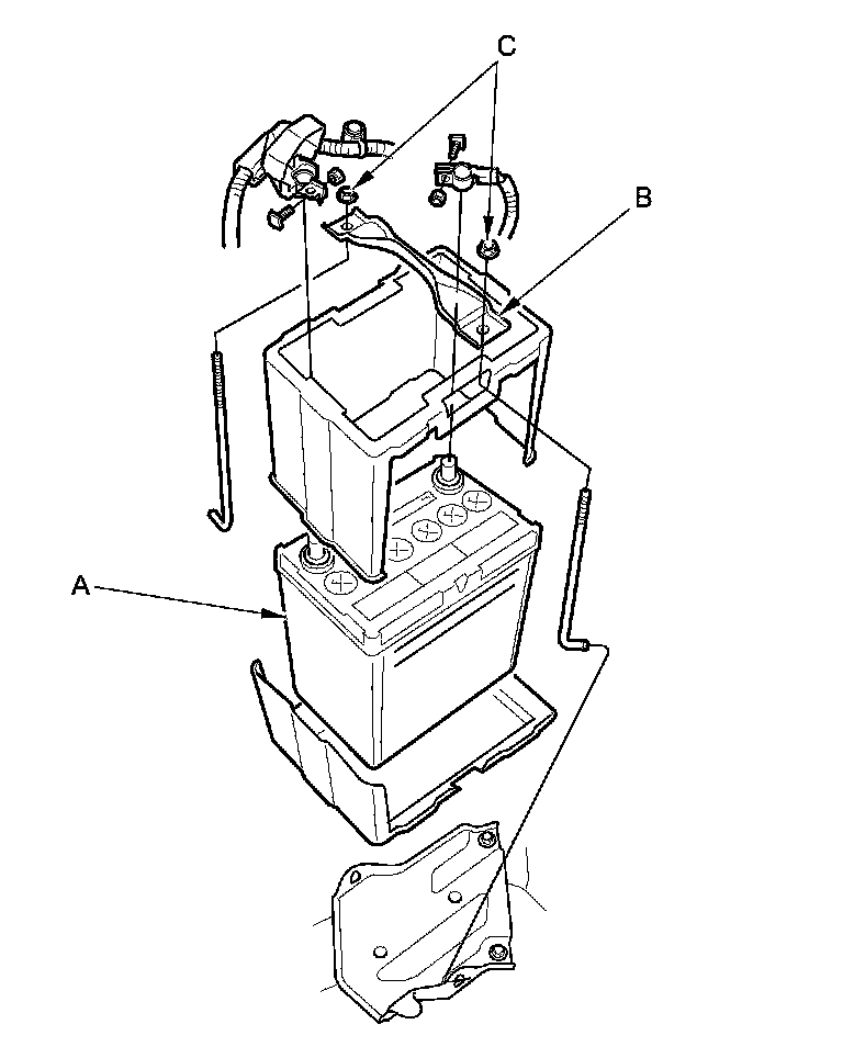 2. Remove the two nuts (A) securing the battery setting plate (B), then remove the battery setting plate and the battery (C).