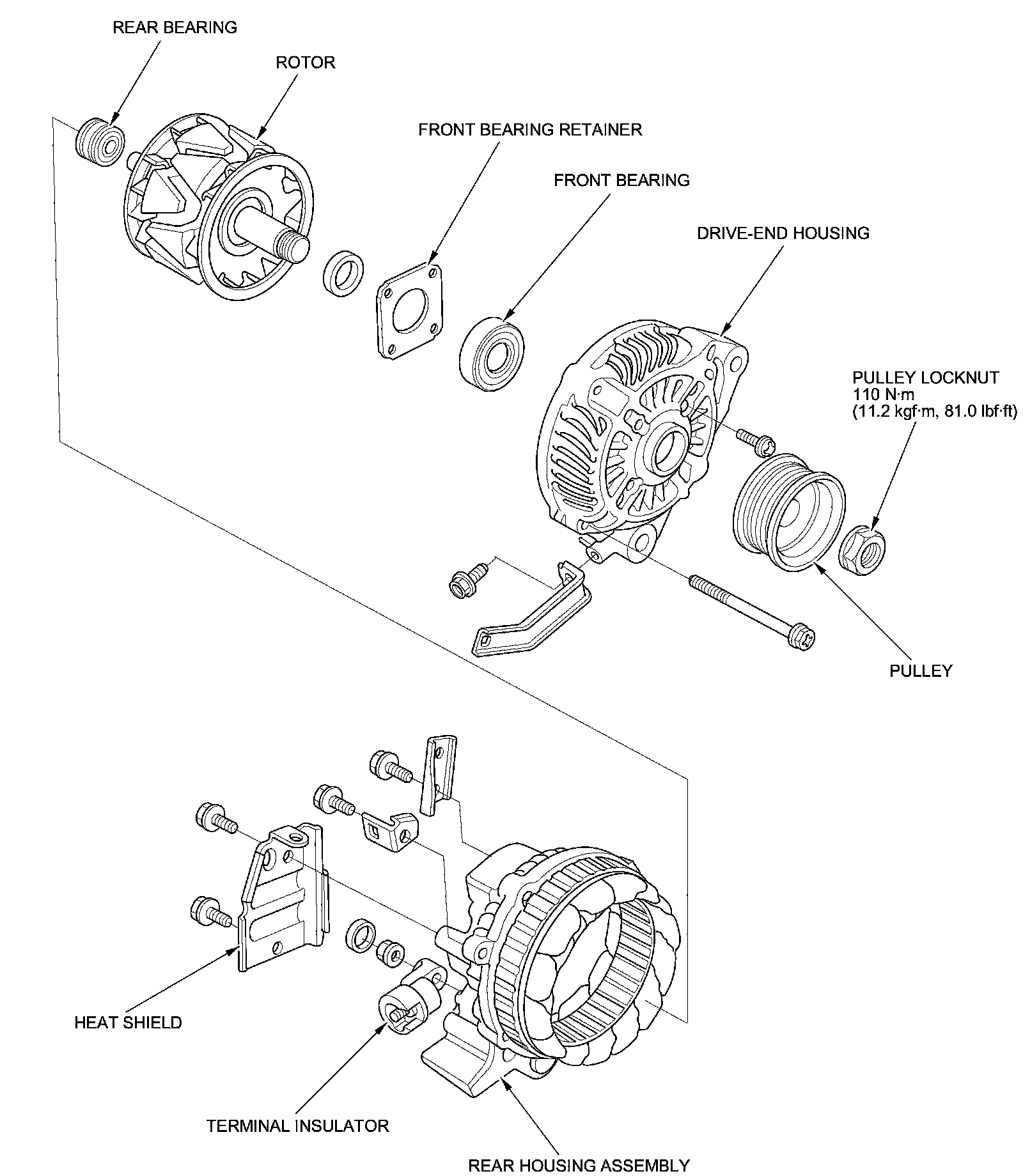 20. If you removed the pulley, put the rotor in the drive-end housing, then tighten its locknut to 110 Nm (11.2 kg-m, 81.0 lb-ft).